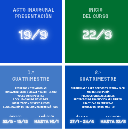 El calendario académico del Máster en Traducción Multimedia se rige por el Calendario Académico del curso 2025/2026 aprobado por el Consejo de Gobierno el 12 de marzo de 2025, modificado el 24 de abril de 2025, y por el Calendario Académico de la Facultade de Filoloxía e Tradución del curso 2025/2026.